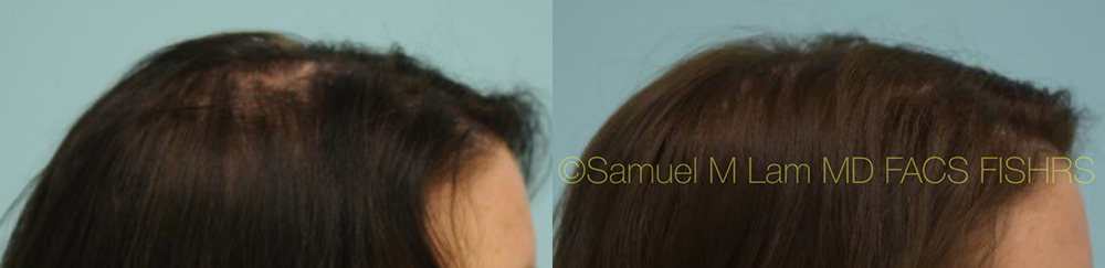 This 46-year-old Asian woman is shown before and 3 1/2 months after starting topical 82M therapy and laser technology for hair loss. She is shown with remarkable improvement along the hairline as well as central density.